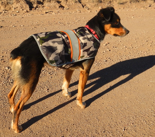 I was very pleased with the Little Buddy heater, it was just the right size for the very small space of an uninsulated van and kept us comfortable until bedtime. I’ll do a full report on it later. Cody adapted really well to the coat and his shivering stopped. The first morning I left it on him when we went for our walk and it didn’t interfere with his movement at all. However, he runs right through brush and trees so it got a little tore up; I’ll never let him walk in it again. It’s perfect for those cold nights though!