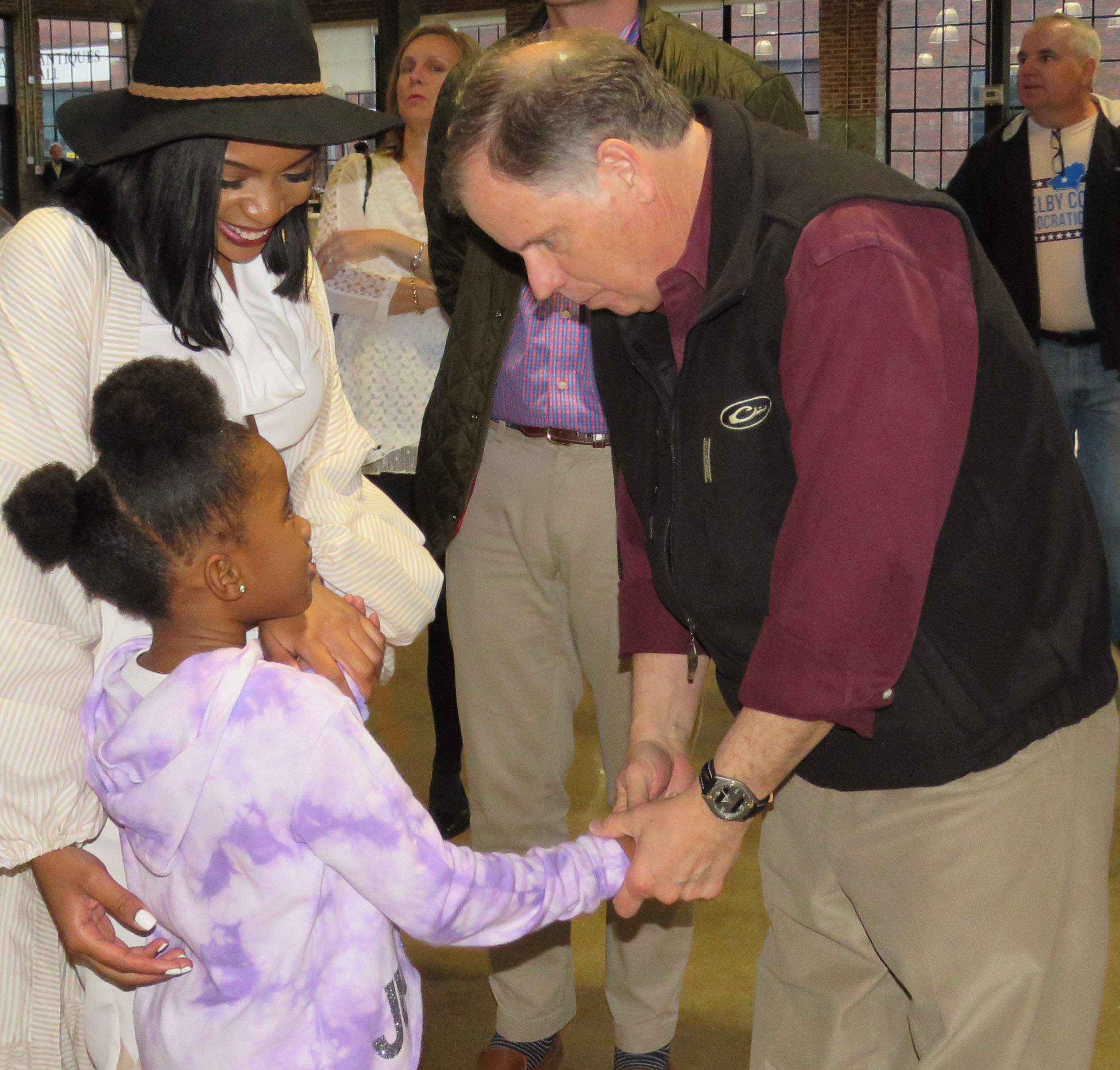 Senator Doug Jones greets a young supporter at a victory party in Birmingham, Sunday, Feb. 25, 2018: Glynn Wilson