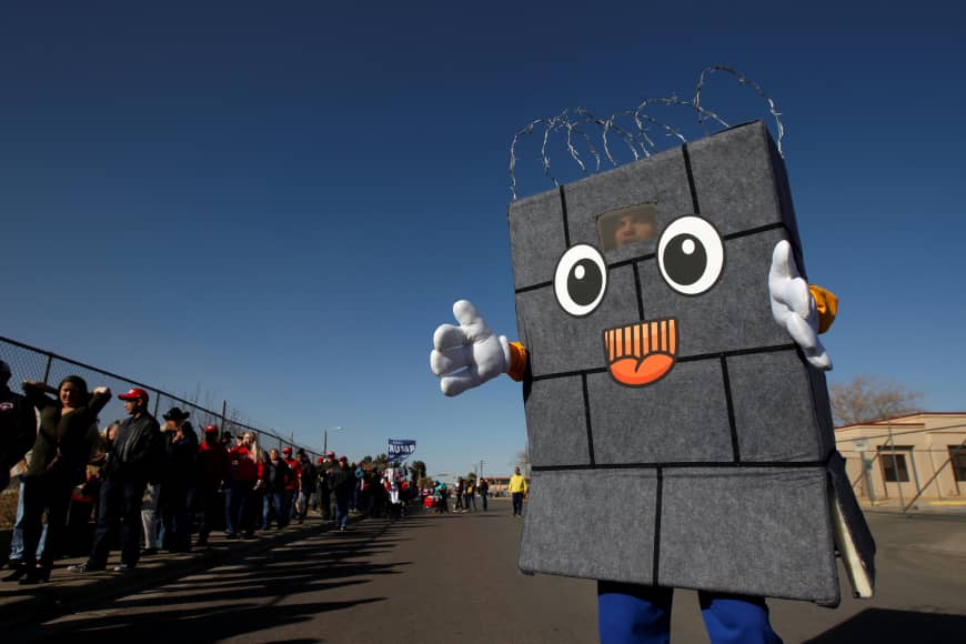 A Trump supporter dressed up as a border wall is seen as others queue to enter El Paso County Coliseum for a rally by U.S. President Donald Trump in El Paso, Texas, on Monday: REUTERS
