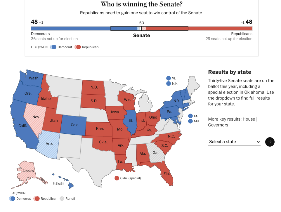 I am going to go out on a limb here and say Democrat Mark Kelly will win the Arizona Senate race, since he is leading by nearly 6 percentage points with 82 percent of the votes counted and reported. The late votes will favor the Democrat. Republicans don’t vote by mail. Trump told them not too.