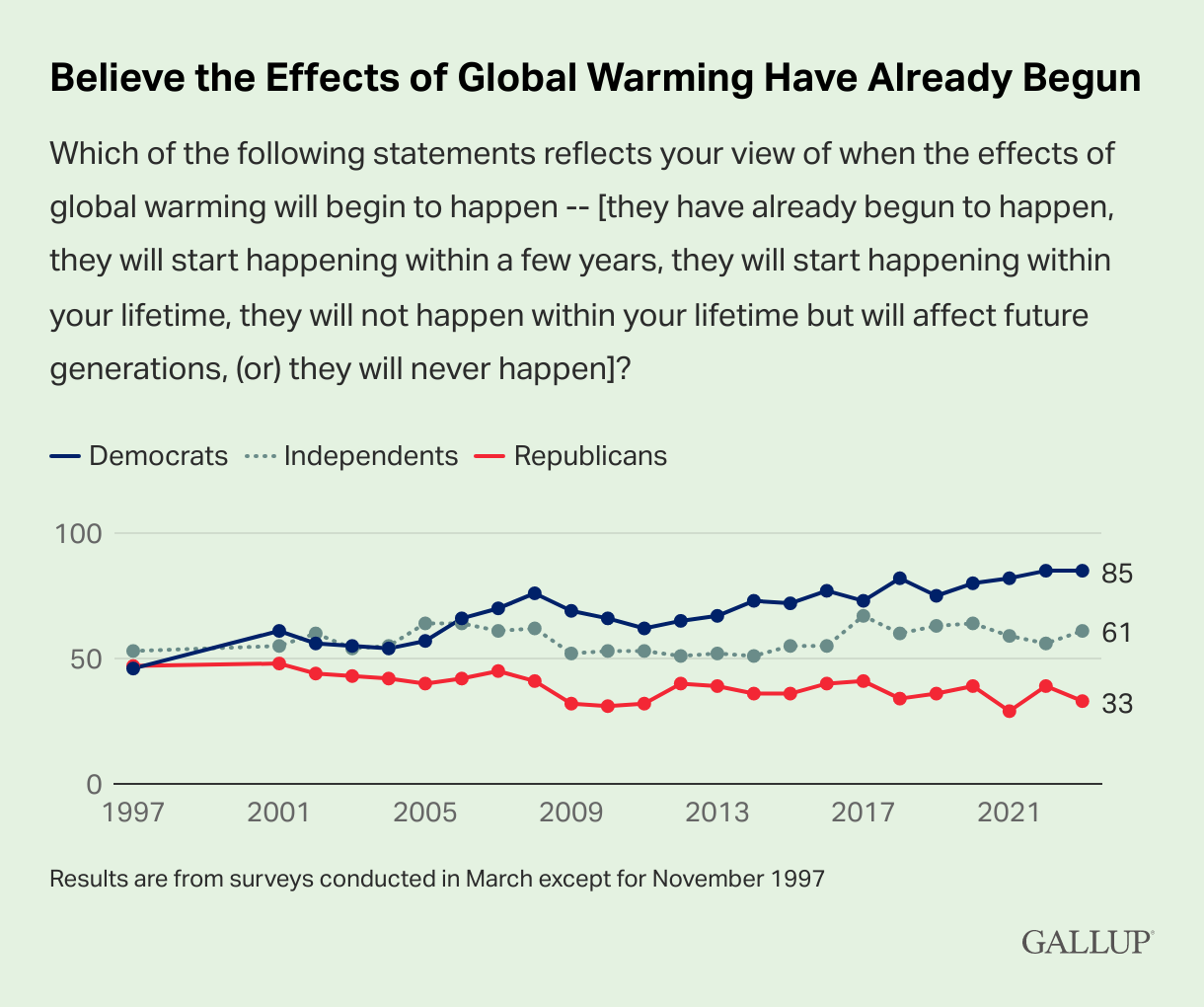Meanwhile, Democrats are convinced that global warming is a problem, with 85 percent saying the effects of global warming have already begun to happen. About 60 percent of independents agree, but only a third of Republicans do.