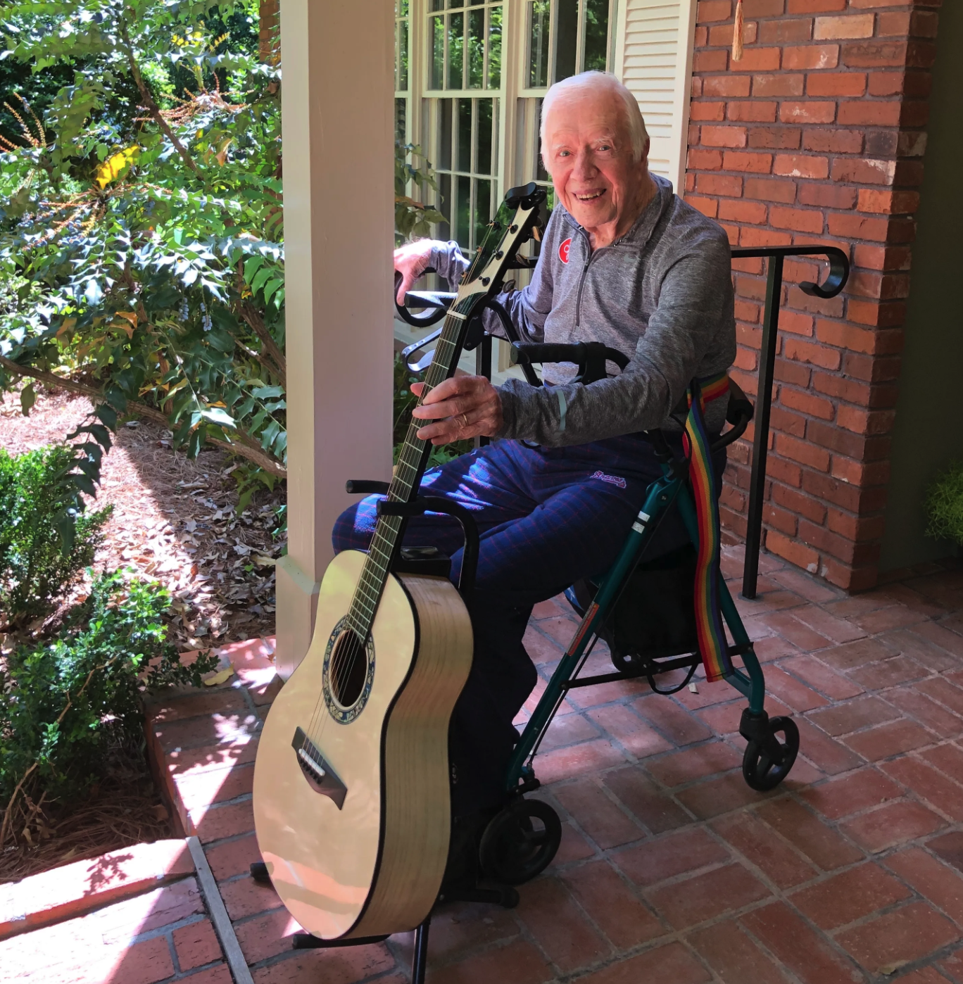 Former President Jimmy Carter with a homemade guitar made from wood out of his yard in Georgia: NAJ screen shot
