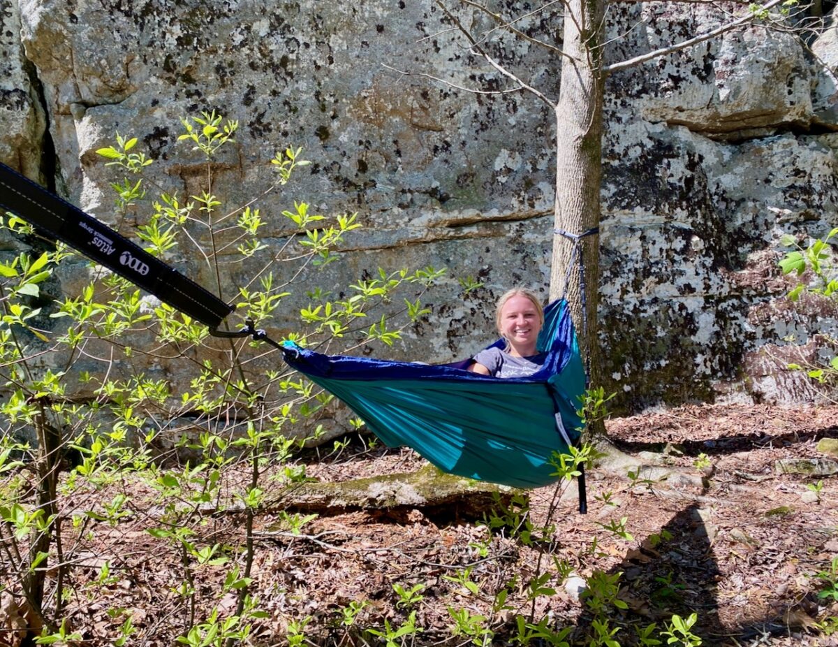 Taking a break resting in a hammock after a day of climbing the rocks at Cherokee Rock Village: Glynn Wilson