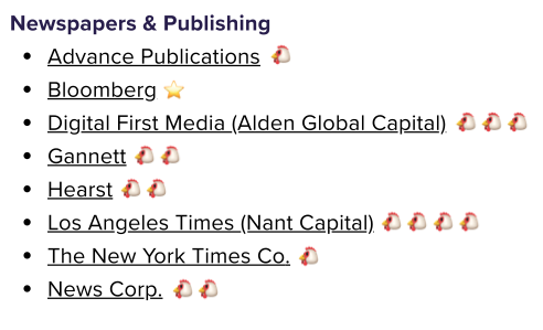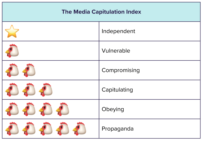 Thirty five of the largest and most influential media organizations in the United States get a rating for their relative independence or lack thereof. The ratings, which come with explanations, range from a star (signaling independence) up to four chickens (signaling propaganda).