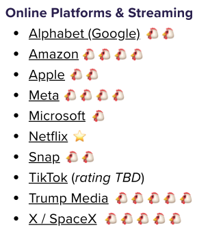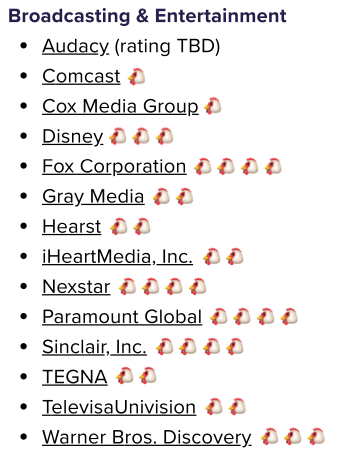 Bloomberg News earned a rare star. The New York Times got one chicken, which means “vulnerable.” Disney (which owns ABC News) got three chickens, which indicates “capitulating,” as did Paramount Global, which owns CBS News. Fox Corp., which includes Fox News, earned the worst-possible rating of four chickens.