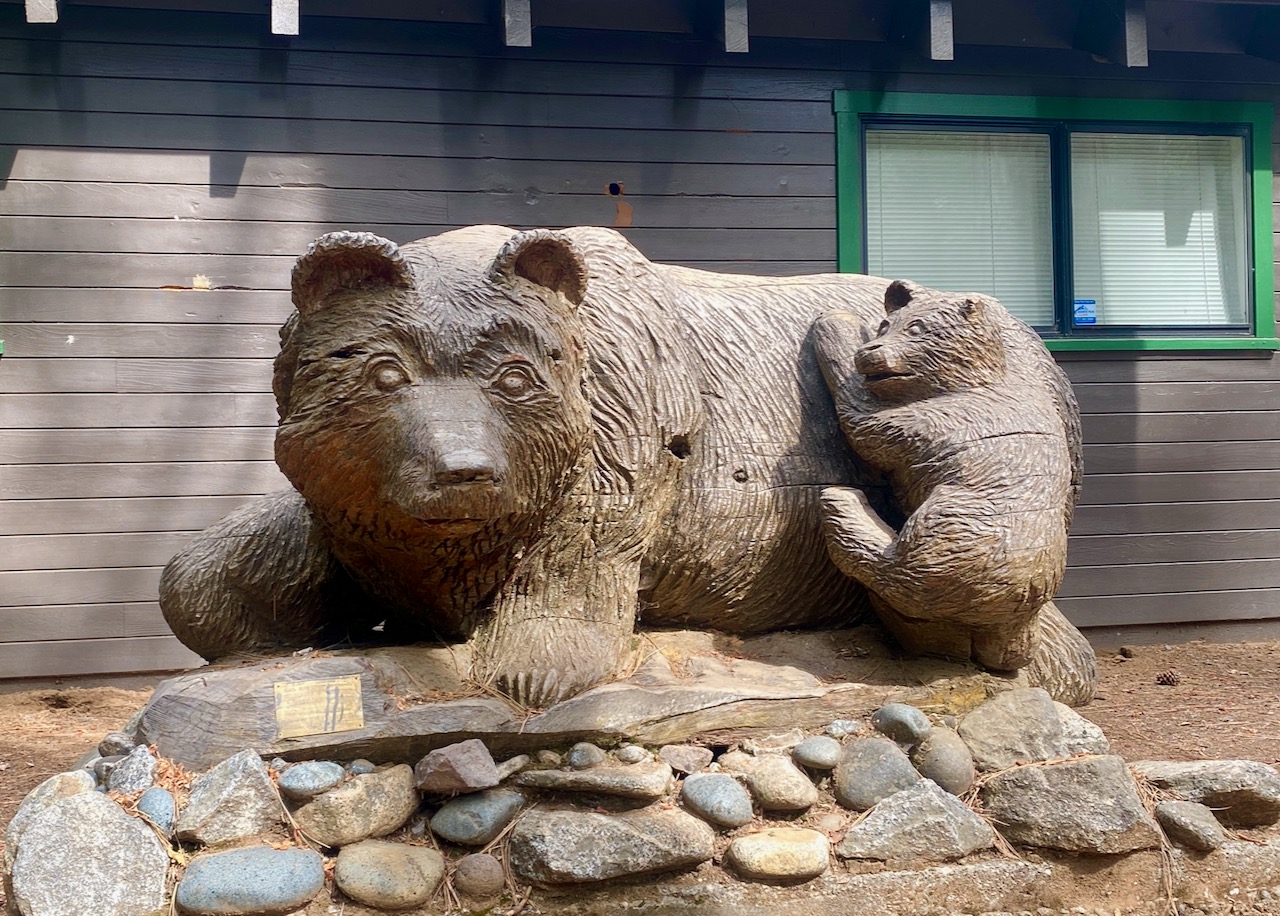 A statue of a mama bear and her cub at the Ranger Station in Big Tree State Park in the Stanislaus National Forest in California: Glynn Wilson