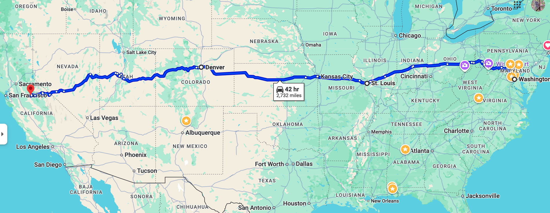 Twain marked his travels down the river from St. Louis to New Orleans in miles traveled and river depths, describing the towns along the way like Hannibal and Cairo. We now mark our travels across this great country in miles traveled on a Google map.