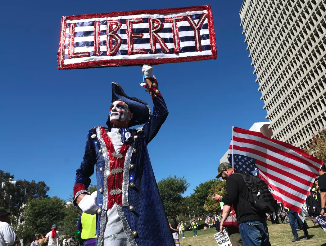 A person calling himself “Dandidi” protests for liberty at the No Kings Day of Peaceful Action in downtown Los Angeles on Saturday. (Genaro Molina / Los Angeles Times)
